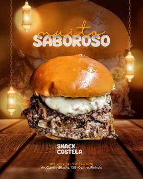 150 gramas de costela desfiada com crêem chesse, maionese de alho, hambúrguer de 90 gramas, queijo mussarela e pão de brioche!